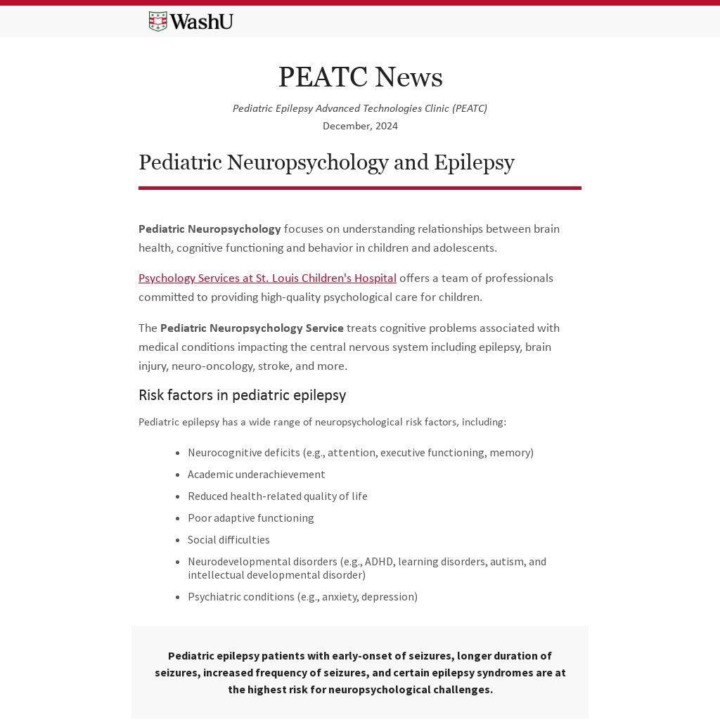 The Pediatric Epilepsy Advanced Technologies Clinic (PEATC) is a specialty concierge clinic at the Washington University NAEC-accredited Level 4 Pediatric Epilepsy Center at St. Louis Children’s Hospital.