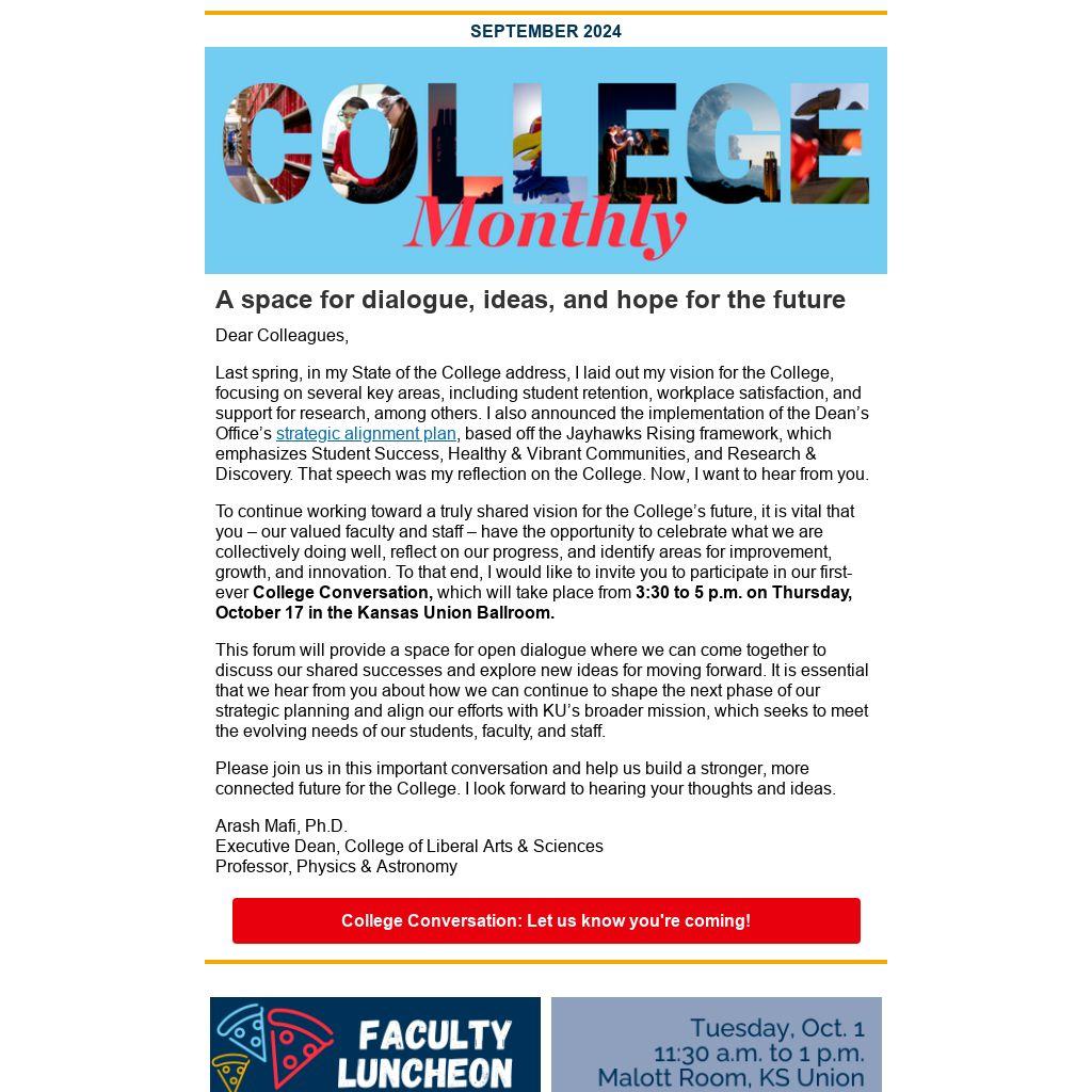 To continue working toward a truly shared vision for the College’s future, it is vital that you – our valued faculty and staff – have the opportunity to celebrate what we are collectively doing well, reflect on our progress, and identify areas for improvement, growth, and innovation. To that end, I would like to invite you to participate in our first-ever College Conversation, which will take place from 3:30 to 5 p.m. on Thursday, October 17 in the Kansas Union Ballroom.