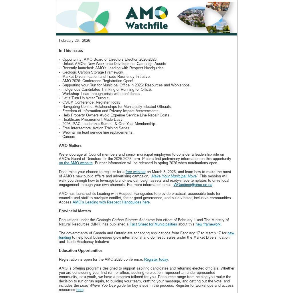 We encourage all Council members and senior municipal employers to consider a leadership role on AMO's Board of Directors for the 2026-2028 term. Please find preliminary information on this opportunity on the AMO website. Further information will be released in spring 2026 when nominations open.