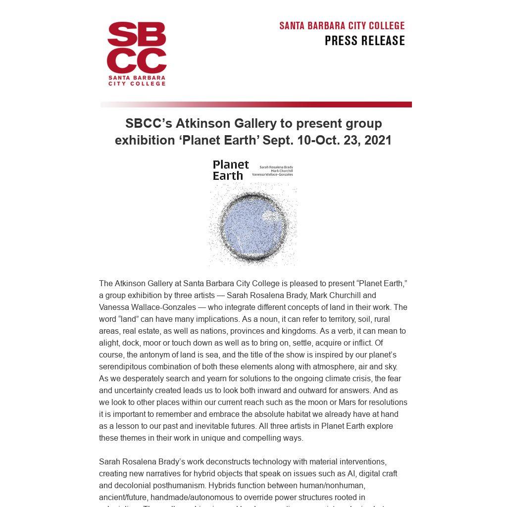The Atkinson Gallery at Santa Barbara City College is pleased to present “Planet Earth,” a group exhibition by three artists — Sarah Rosalena Brady, Mark Churchill and Vanessa Wallace-Gonzales — who integrate different concepts of land in their work. The word “land” can have many implications. As a noun, it can refer to territory, soil, rural areas, real estate, as well as nations, provinces and kingdoms. As a verb, it can mean to alight, dock, moor or touch down as well as to bring on, settle, acquire or inflict. Of course, the antonym of land is sea, and the title of the show is inspired by our planet’s serendipitous combination of both these elements along with atmosphere, air and sky. As we desperately search and yearn for solutions to the ongoing climate crisis, the fear and uncertainty created leads us to look both inward and outward for answers. And as we look to other places within our current reach such as the moon or Mars for resolutions it is important to remember and embrace the absolute habitat we already have at hand as a lesson to our past and inevitable futures. All three artists in Planet Earth explore these themes in their work in unique and compelling ways.