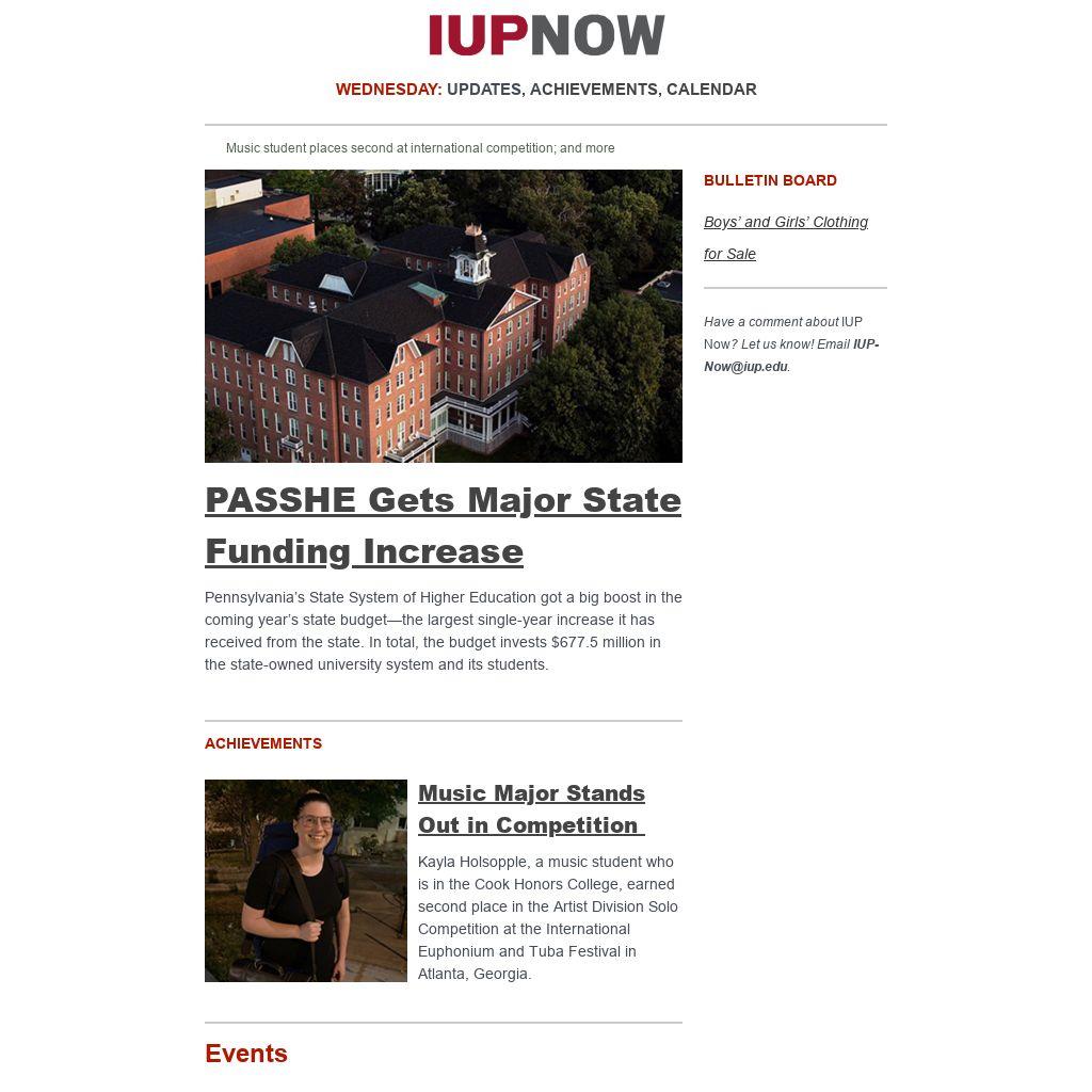 Distributed to IUP employees and students once a week on its summer schedule, IUP Now is the official newsletter of Indiana University of Pennsylvania. It features news from across the IUP website, compiled by the Division of Marketing and Communications. Find out how to get your news and events in IUP Now.