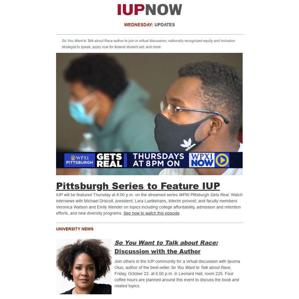 IUP will be featured Thursday at 8:00 p.m. on the streamed series WPXI Pittsburgh Gets Real. Watch interviews with Michael Driscoll, president; Lara Luetkehans, interim provost; and faculty members Veronica Watson and Emily Wender on topics including college affordability, admission and retention efforts, and new diversity programs. See how to watch this episode.