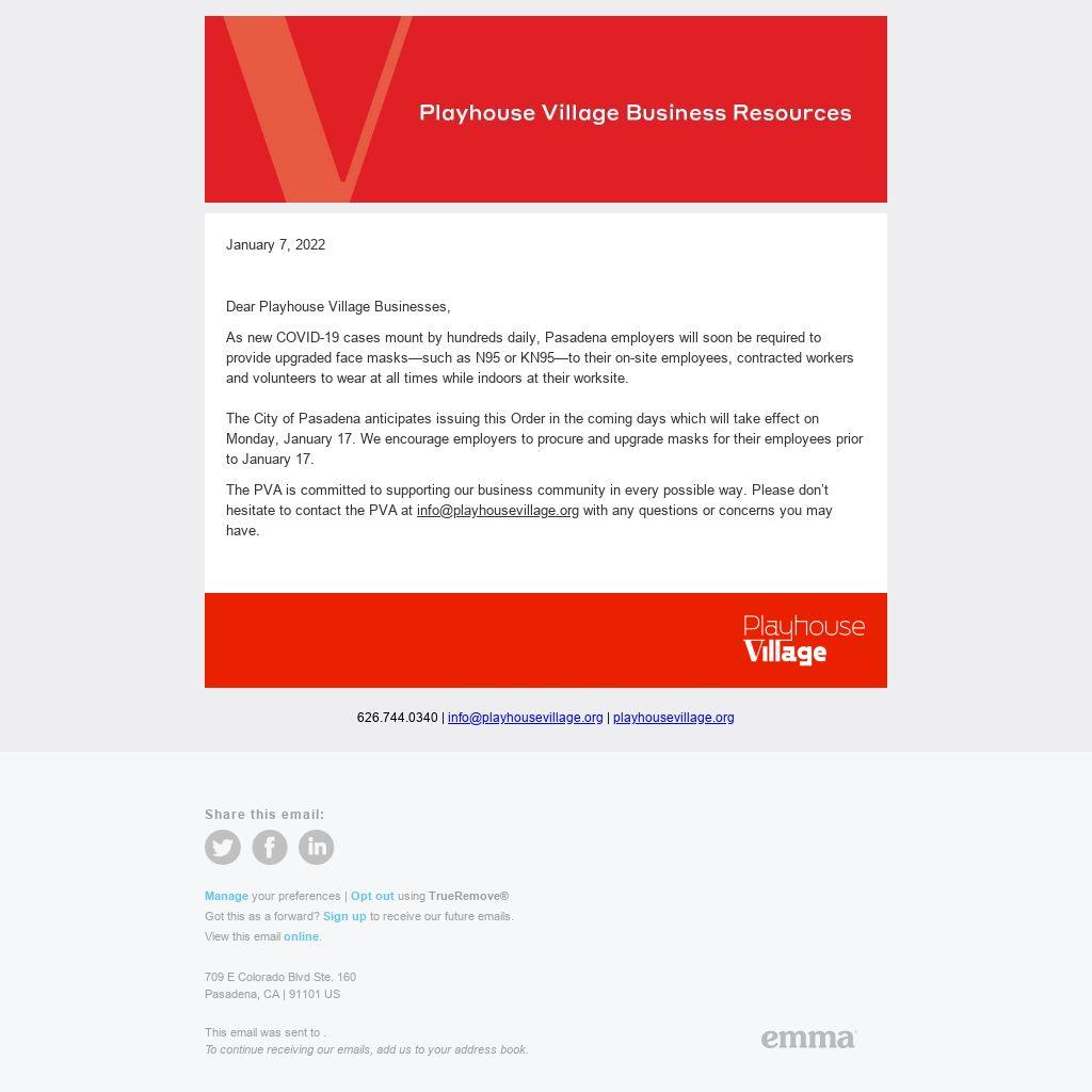 The City of Pasadena anticipates issuing this Order in the coming days which will take effect on Monday, January 17. We encourage employers to procure and upgrade masks for their employees prior to January 17.