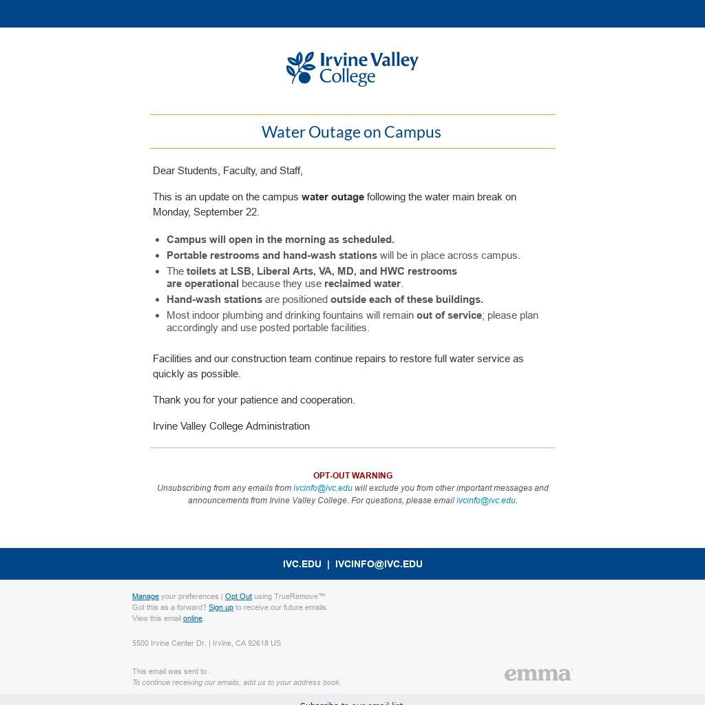 Unsubscribing from any emails from ivcinfo@ivc.edu will exclude you from other important messages and announcements from Irvine Valley College. For questions, please email ivcinfo@ivc.edu.