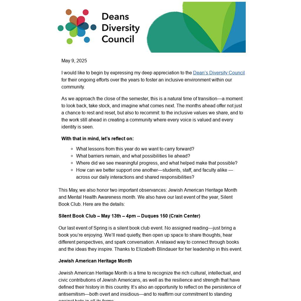 Our last event of Spring is a silent book club event. No assigned reading—just bring a book you’re enjoying. We’ll read quietly, then open up space to share thoughts, hear different perspectives, and spark conversation. A relaxed way to connect through books and the ideas they inspire. Thanks to Elizabeth Blindauer for her leadership in this event.