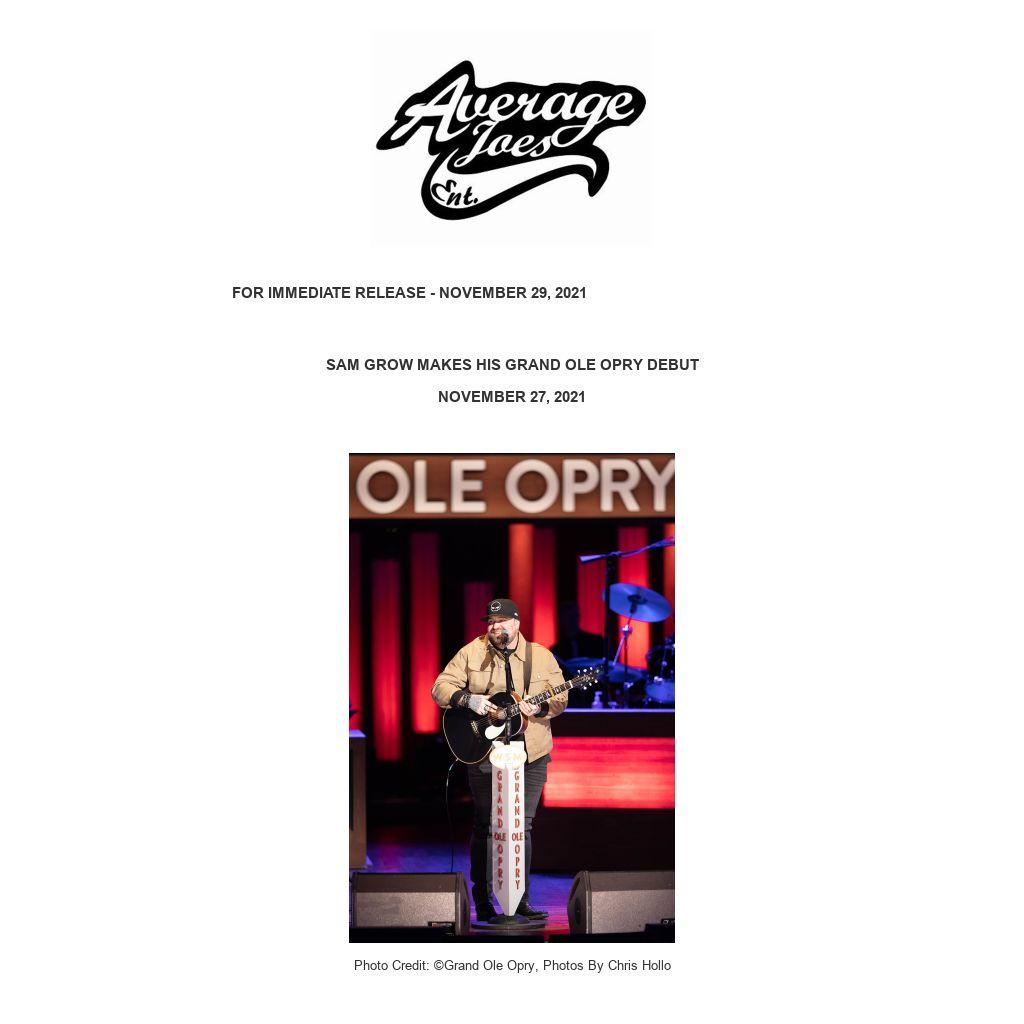 Nashville, TN, (Nov. 29, ’21)…Average Joes Entertainment artist Sam Grow stepped onto the stage of the Grand Ole Opry for the first time Saturday night November 27, 2021, after being introduced by Opry host Mike Terry. As he stood in the famed inner circle, Grow performed his breakthrough hit, “Song About You,” followed by an acoustic version of “Go Right Now,” an emotional song he wrote for his father who passed away in 2018. Grow received a warm welcome followed by a standing ovation from the audience that included family, friends, and fans from near and far.