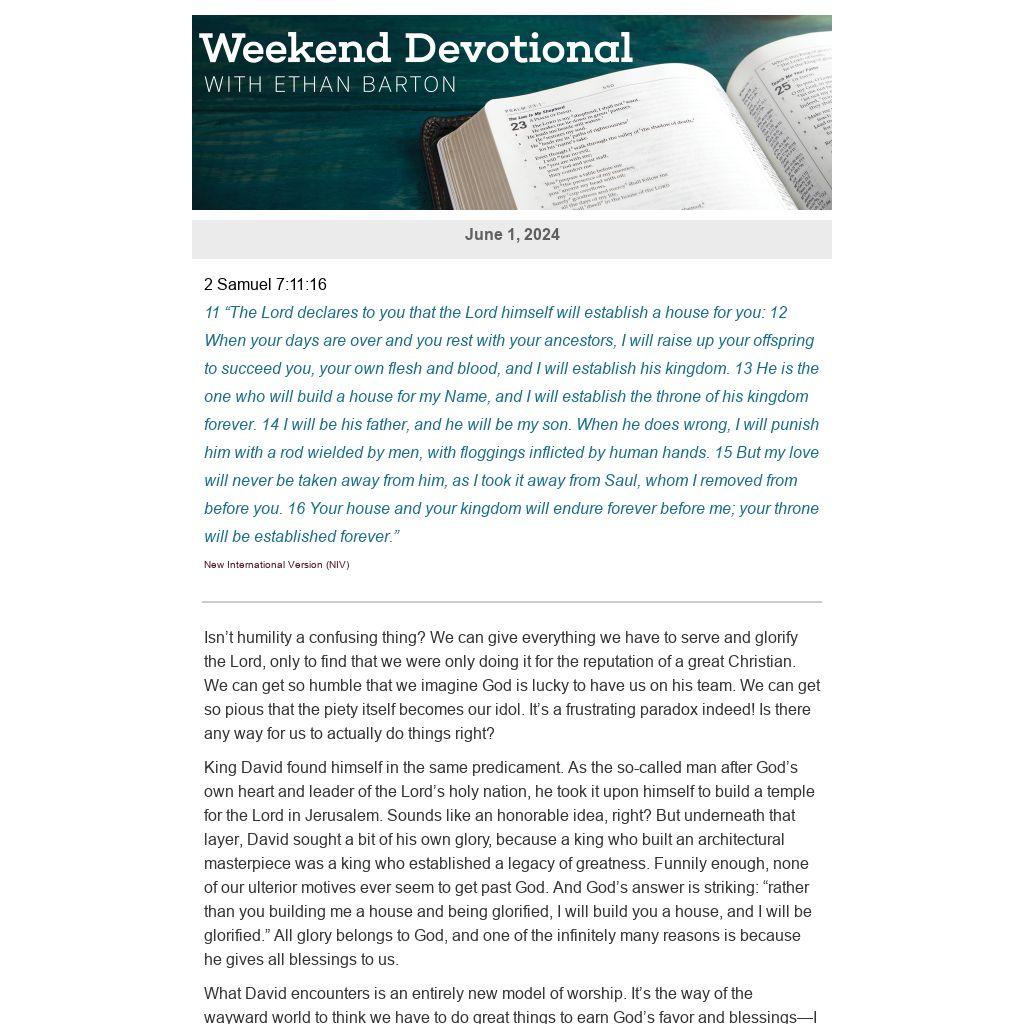 King David found himself in the same predicament. As the so-called man after God’s own heart and leader of the Lord’s holy nation, he took it upon himself to build a temple for the Lord in Jerusalem. Sounds like an honorable idea, right? But underneath that layer, David sought a bit of his own glory, because a king who built an architectural masterpiece was a king who established a legacy of greatness. Funnily enough, none of our ulterior motives ever seem to get past God. And God’s answer is striking: “rather than you building me a house and being glorified, I will build you a house, and I will be glorified.” All glory belongs to God, and one of the infinitely many reasons is because he gives all blessings to us.