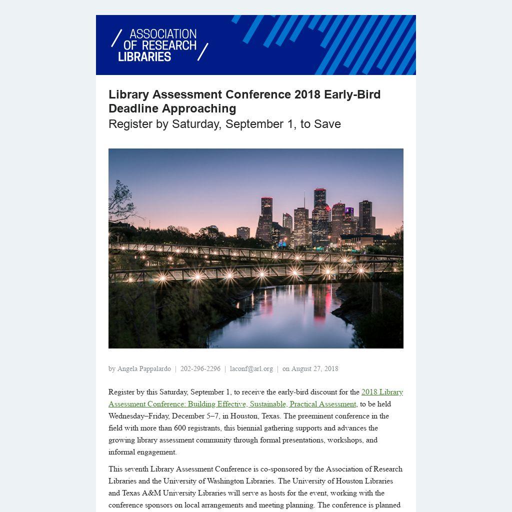 2018 Library Assessment Conference: Building Effective, Sustainable, Practical Assessment, to be held Wednesday–Friday, December 5–7, in Houston, Texas. The preeminent conference in the field with more than 600 registrants, this biennial gathering supports and advances the growing library assessment community through formal presentations, workshops, and informal engagement.
