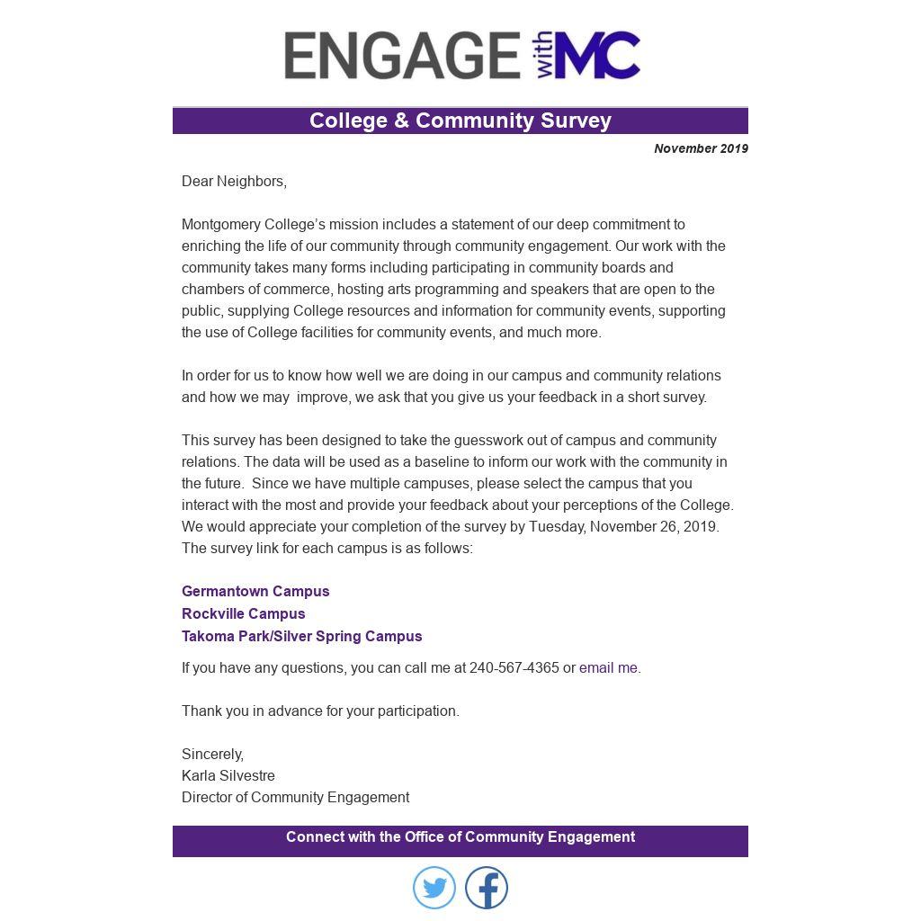 This survey has been designed to take the guesswork out of campus and community relations. The data will be used as a baseline to inform our work with the community in the future. Since we have multiple campuses, please select the campus that you interact with the most and provide your feedback about your perceptions of the College. We would appreciate your completion of the survey by Tuesday, November 26, 2019. The survey link for each campus is as follows: