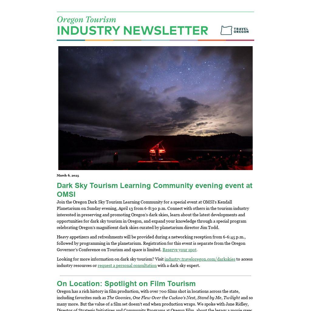Dark Sky Tourism Learning Community evening event at OMSIJoin the Oregon Dark Sky Tourism Learning Community for a special event at OMSI’s Kendall Planetarium on Sunday evening, April 13 from 6-8:30 p.m. Connect with others in the tourism industry interested in preserving and promoting Oregon’s dark skies, learn about the latest developments and opportunities for dark sky tourism in Oregon, and expand your knowledge through a special program celebrating Oregon’s magnificent dark skies curated by planetarium director Jim Todd.