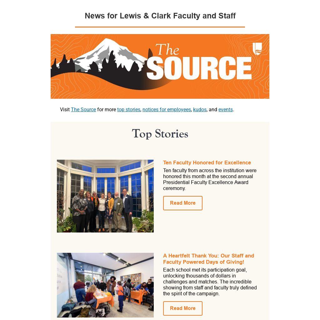 The Source is produced by Lewis & Clark's Office of Communications, and is distributed weekly to lc-employees@lclark.edu. Please write to us with your ideas, stories, and events—including specific date requests for promotion. Although there is no option for employees to unsubscribe, please do not mark this email as spam as doing so may negatively impact Lewis & Clark's reputation with Google as a trustworthy sender. Learn more about Lewis & Clark’s efforts to protect the email reputation of our lclark.edu domain.