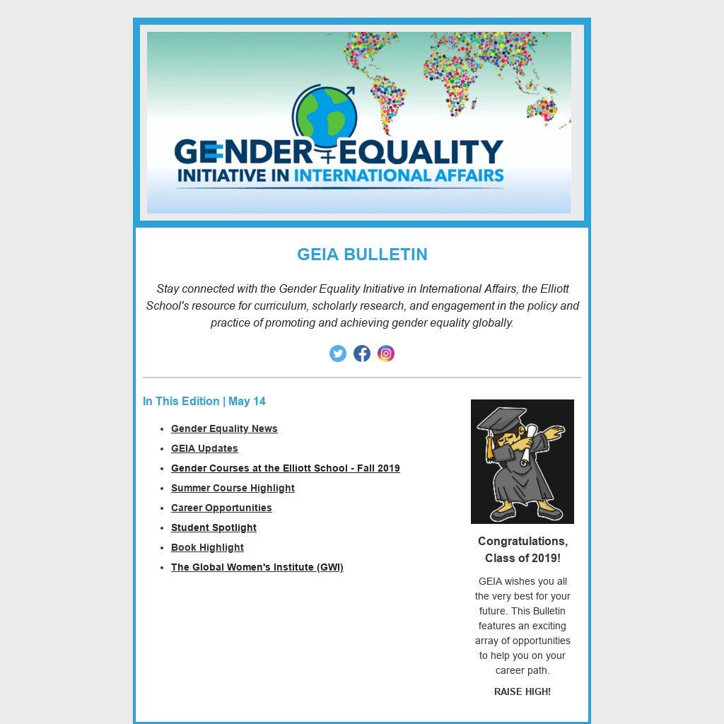Stay connected with the Gender Equality Initiative in International Affairs, the Elliott School's resource for curriculum, scholarly research, and engagement in the policy and practice of promoting and achieving gender equality globally.