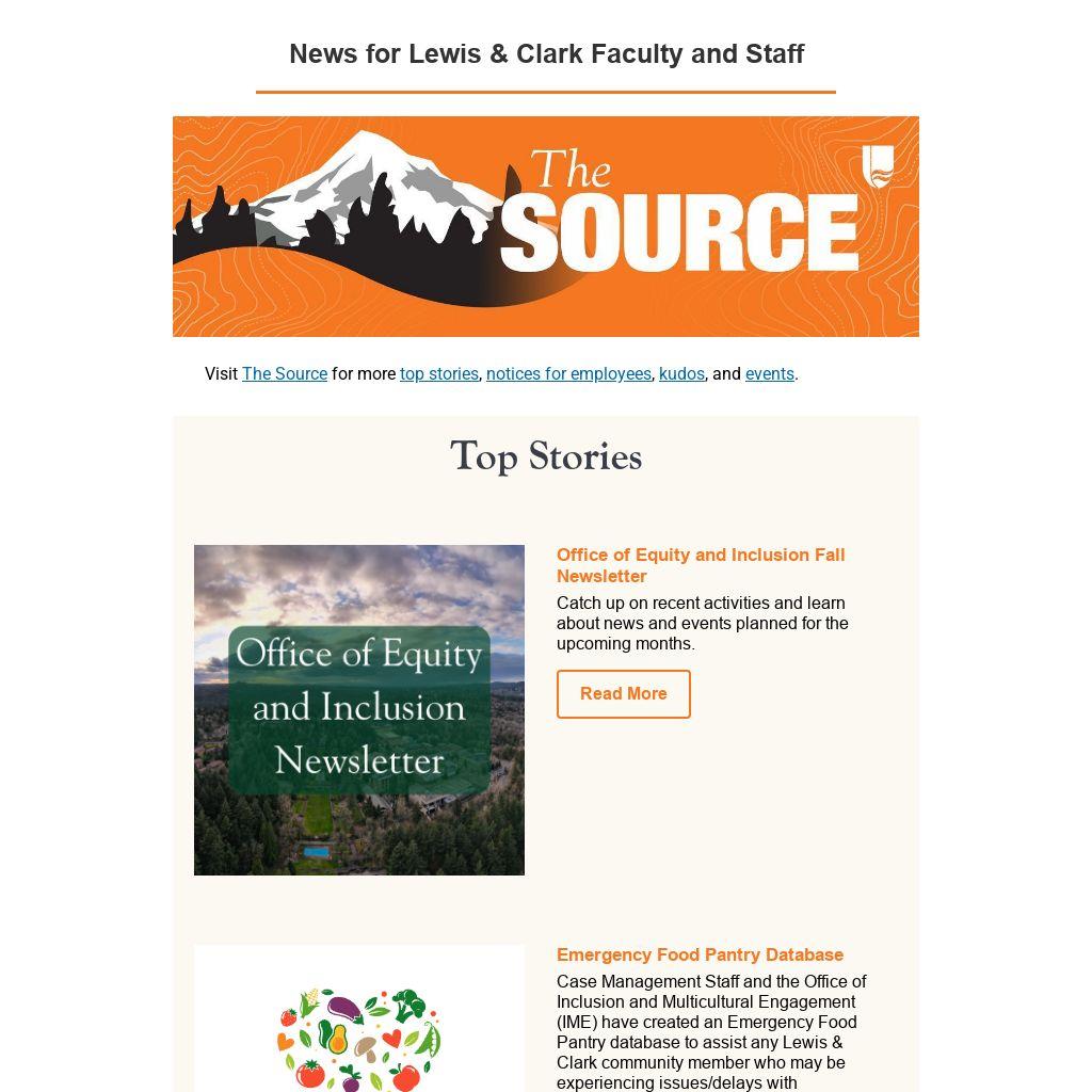 The Source is produced by Lewis & Clark's Office of Communications, and is distributed weekly to lc-employees@lclark.edu. Please write to us with your ideas, stories, and events—including specific date requests for promotion. Although there is no option for employees to unsubscribe, please do not mark this email as spam as doing so may negatively impact Lewis & Clark's reputation with Google as a trustworthy sender. Learn more about Lewis & Clark’s efforts to protect the email reputation of our lclark.edu domain.