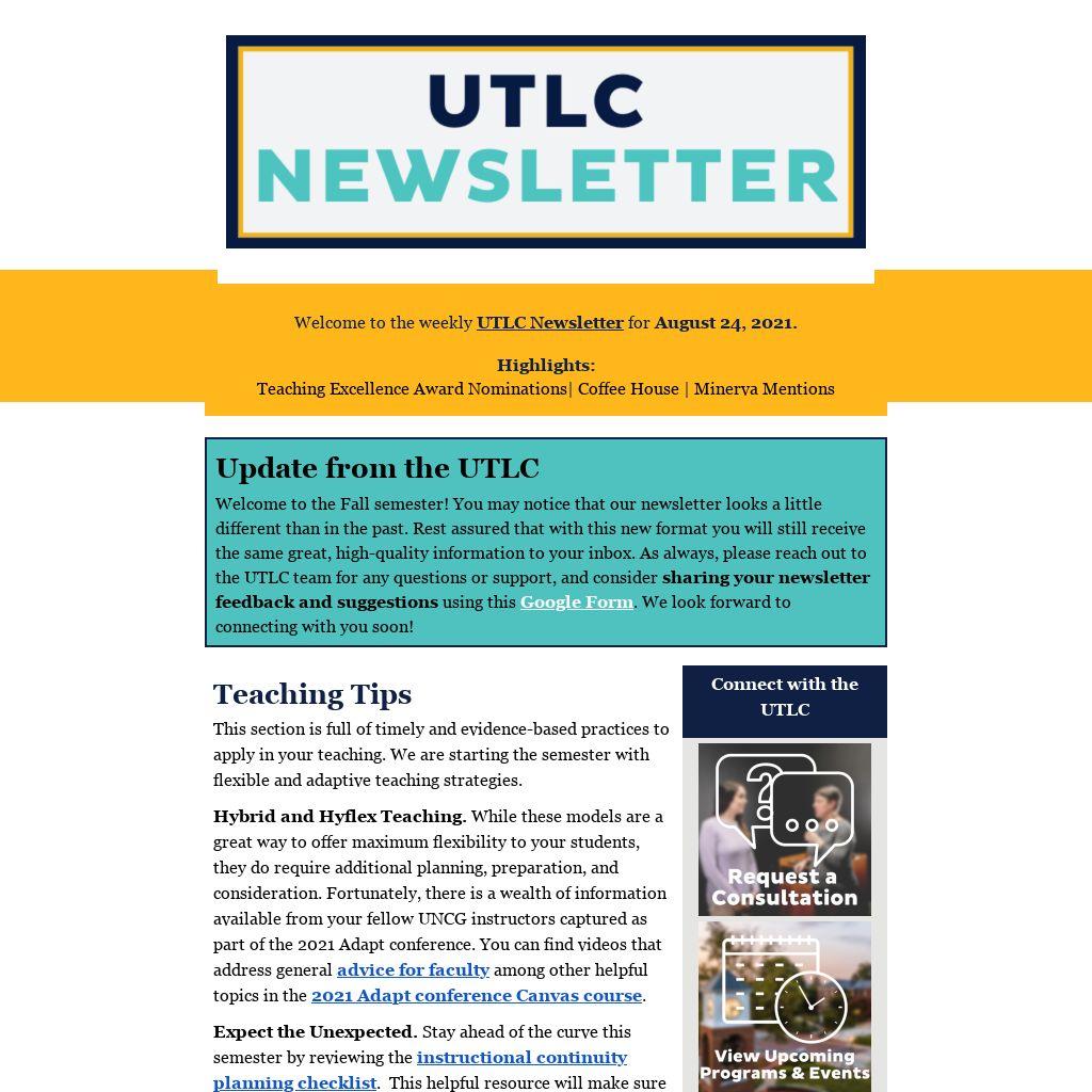 Update from the UTLCWelcome to the Fall semester! You may notice that our newsletter looks a little different than in the past. Rest assured that with this new format you will still receive the same great, high-quality information to your inbox. As always, please reach out to the UTLC team for any questions or support, and consider sharing your newsletter feedback and suggestions using this Google Form. We look forward to connecting with you soon!