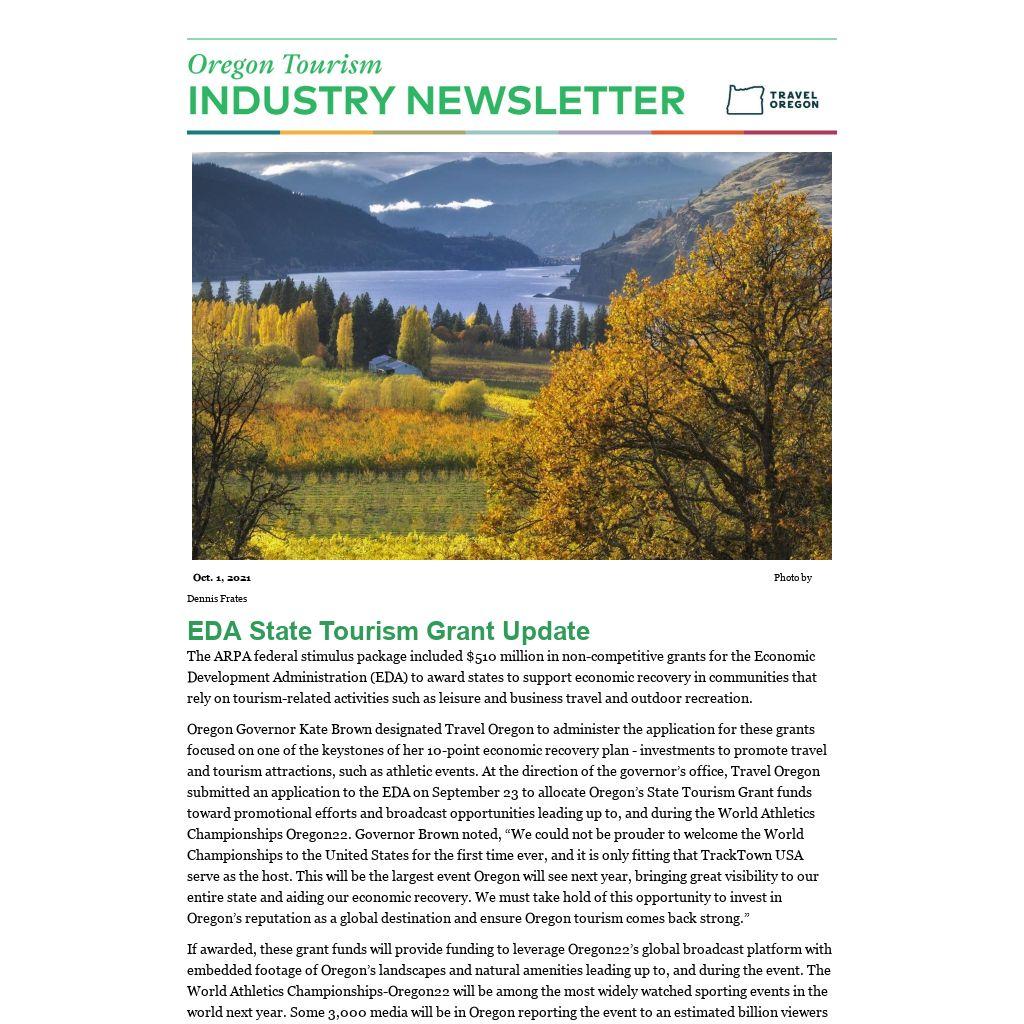 The ARPA federal stimulus package included $510 million in non-competitive grants for the Economic Development Administration (EDA) to award states to support economic recovery in communities that rely on tourism-related activities such as leisure and business travel and outdoor recreation.