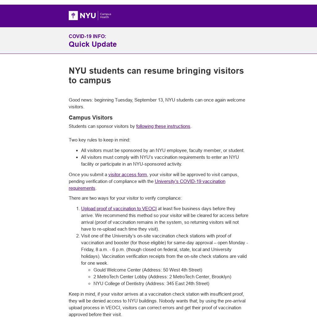 Good news: beginning Tuesday, September 13, NYU students can once again welcome visitors.