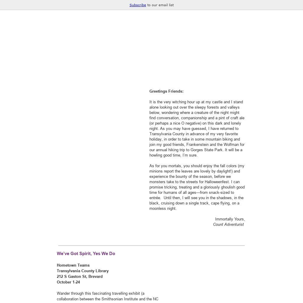 It is the very witching hour up at my castle and I stand alone looking out over the sleepy forests and valleys below, wondering where a creature of the night might find conversation, companionship and a pint of craft ale (or perhaps a nice O negative) on this dark and lonely night. As you may have guessed, I have returned to Transylvania County in advance of my very favorite holiday, in order to take in some mountain biking and join my good friends, Frankenstein and the Wolfman for our annual hiking trip to Gorges State Park. It will be a howling good time, I’m sure.