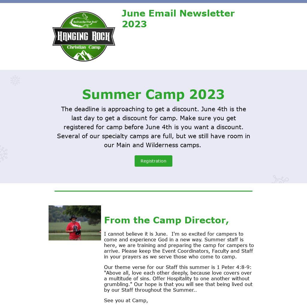I cannot believe it is June. I'm so excited for campers to come and experience God in a new way. Summer staff is here, we are training and preparing the camp for campers to arrive. Please keep the Event Coordinators, Faculty and Staff in your prayers as we serve those who come to camp.