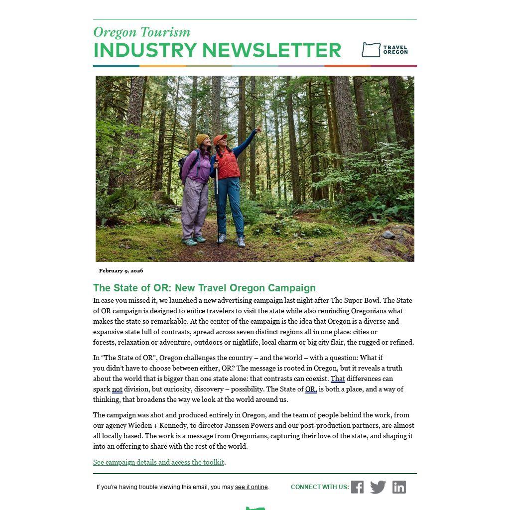 In case you missed it, we launched a new advertising campaign last night after The Super Bowl. The State of OR campaign is designed to entice travelers to visit the state while also reminding Oregonians what makes the state so remarkable. At the center of the campaign is the idea that Oregon is a diverse and expansive state full of contrasts, spread across seven distinct regions all in one place: cities or forests, relaxation or adventure, outdoors or nightlife, local charm or big city flair, the rugged or refined.