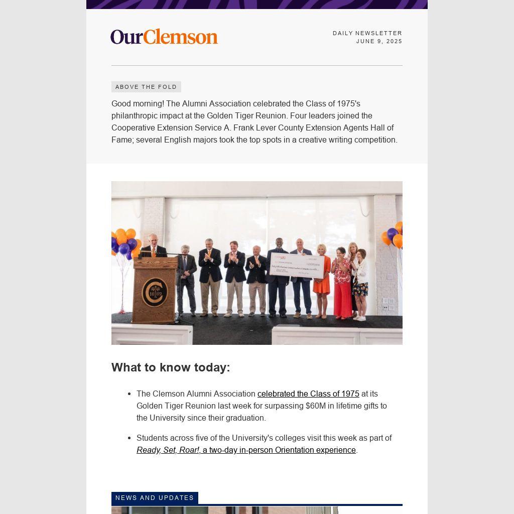 Good morning! The Alumni Association celebrated the Class of 1975's philanthropic impact at the Golden Tiger Reunion. Four leaders joined the Cooperative Extension Service A. Frank Lever County Extension Agents Hall of Fame; several English majors took the top spots in a creative writing competition.