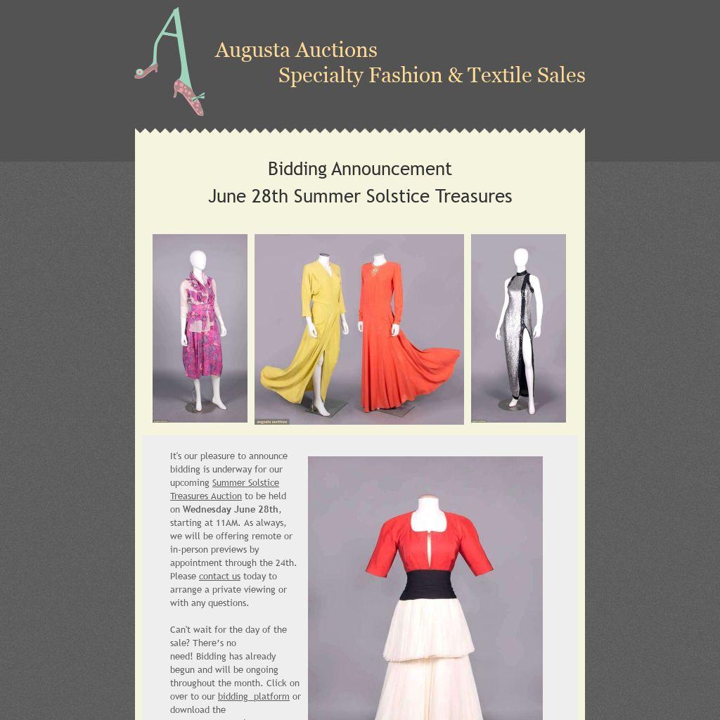 As always, Augusta Auctions remains THE source for early 20th century tea gowns, 19th- early 20th c day ensembles, 20's flapper dresses, and fabulous party dresses & evening wear from all eras. Designer and vintage wearables abound with offerings from Emilio Pucci, Comme des Garcons, Bonnie Cashin, Galanos, Irene, Alexander McQueen, Ceil Chapman, Geoffrey Beene, Chanel and Dior.