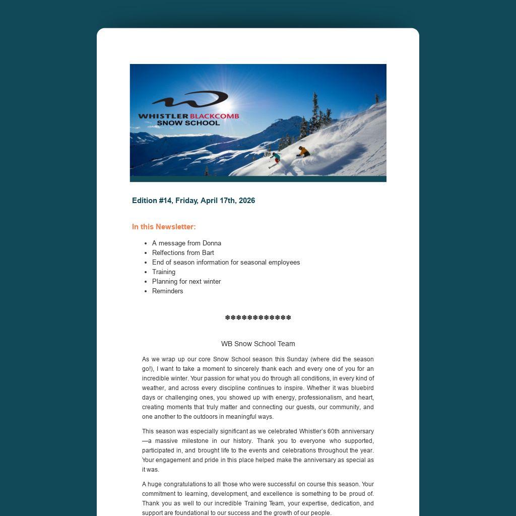 To our leadership team, thank you for your guidance, care, and unwavering support of our people throughout the season. I’d like to personally thank Donna Kerr, who is retiring today after 38 years at Whistler Blackcomb. She’ll likely make some comment in her note that she’s been at WB for longer then I’ve been alive, it’s true! Donna’s vision and leadership over the years has truly made Whistler Kids into what it is today. A Snow School for children that highlights the fun and passion that drew us all to Whistler Blackcomb and the snowsports industry. Through her mentorship she has had an incredible impact on some many leaders here at WB, impacts that extend well beyond the Snow School. We will be forever grateful for her time here and she will be incredibly missed! Thank you for everything Donna!