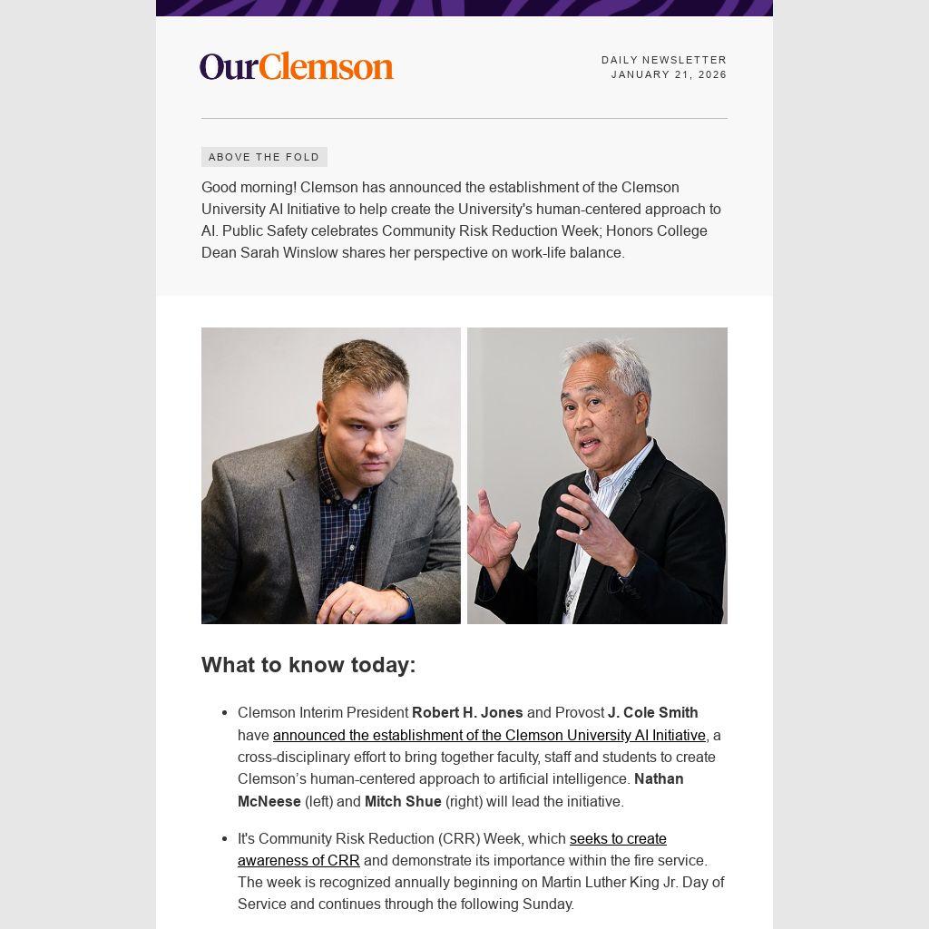 Good morning! Clemson has announced the establishment of the Clemson University AI Initiative to help create the University's human-centered approach to AI. Public Safety celebrates Community Risk Reduction Week; Honors College Dean Sarah Winslow shares her perspective on work-life balance.