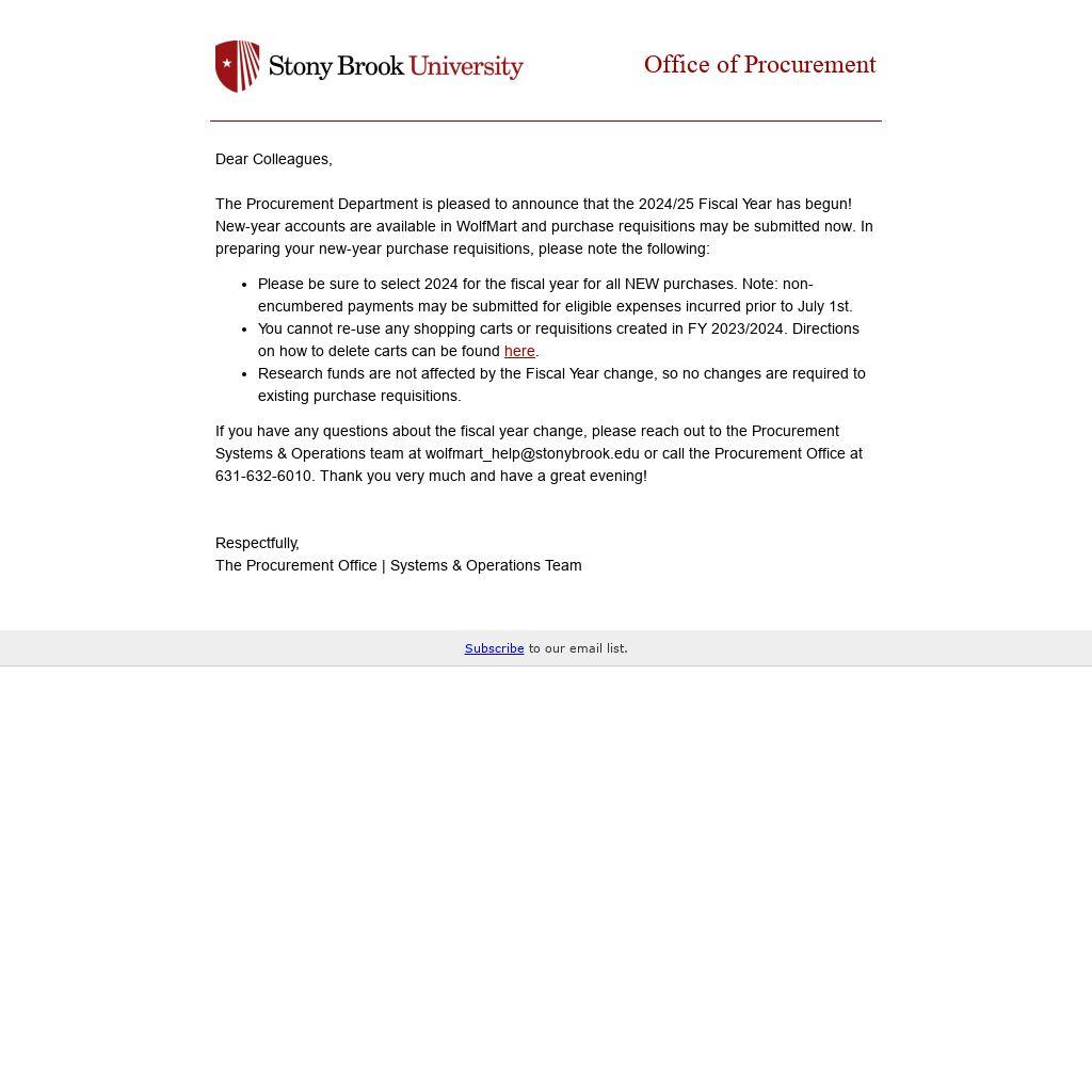 If you have any questions about the fiscal year change, please reach out to the Procurement Systems & Operations team at wolfmart_help@stonybrook.edu or call the Procurement Office at 631-632-6010. Thank you very much and have a great evening!