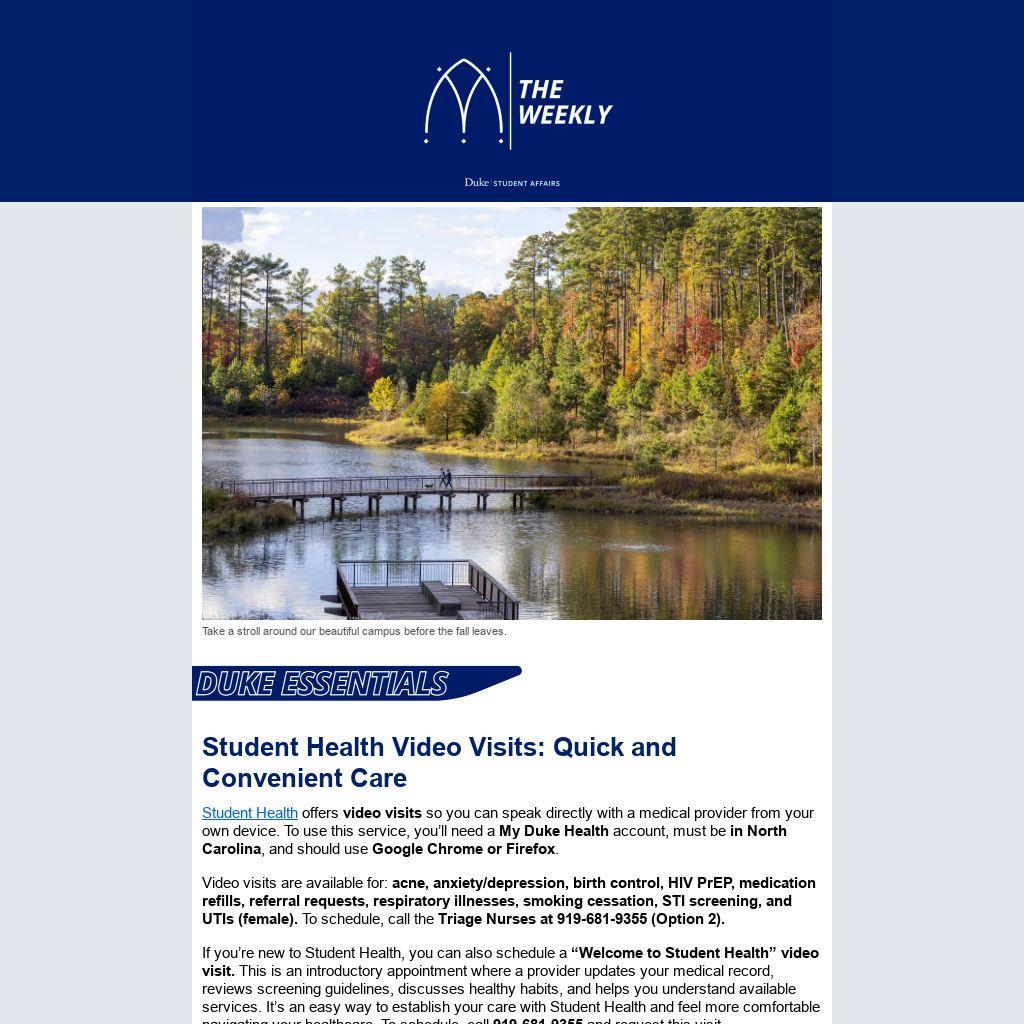 If you’re new to Student Health, you can also schedule a “Welcome to Student Health” video visit. This is an introductory appointment where a provider updates your medical record, reviews screening guidelines, discusses healthy habits, and helps you understand available services. It’s an easy way to establish your care with Student Health and feel more comfortable navigating your healthcare. To schedule, call 919-681-9355 and request this visit.