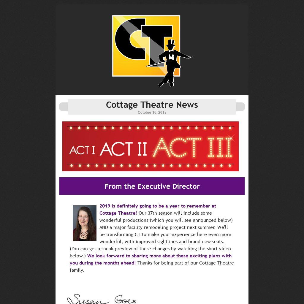 2019 is definitely going to be a year to remember at Cottage Theatre! Our 37th season will include some wonderful productions (which you will see announced below) AND a major facility remodeling project next summer. We'll be transforming CT to make your experience here even more wonderful, with improved sightlines and brand new seats. (You can get a sneak preview of these changes by watching the short video below.) We look forward to sharing more about these exciting plans with you during the months ahead! Thanks for being part of our Cottage Theatre family.