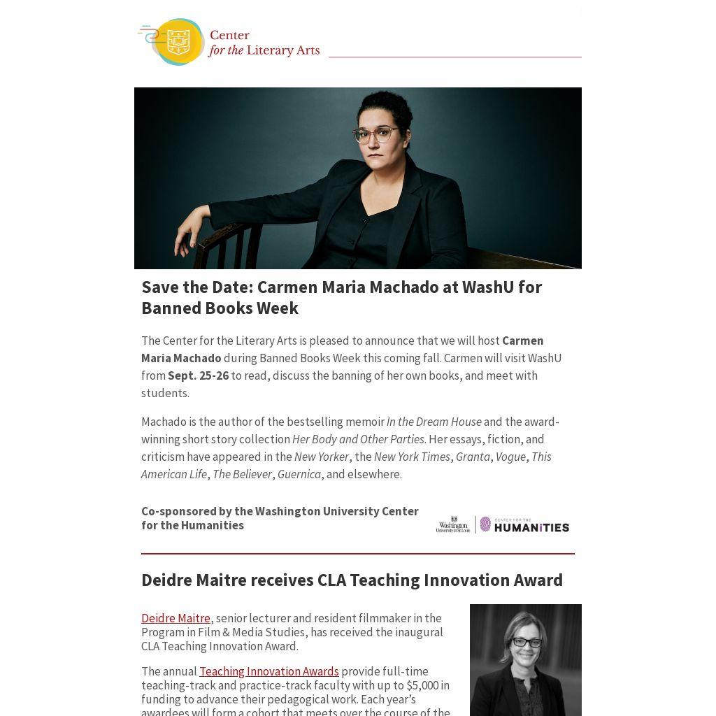 The Center for the Literary Arts is pleased to announce that we will host Carmen Maria Machado during Banned Books Week this coming fall. Carmen will visit WashU from Sept. 25-26 to read, discuss the banning of her own books, and meet with students.