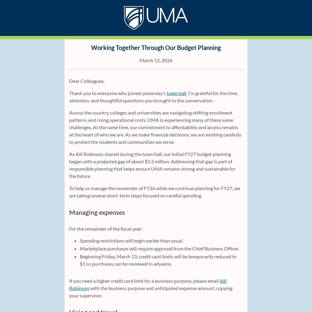I know that conversations about budgets and change can create uncertainty. Please know that this work is being approached thoughtfully and with deep respect for the people who make UMA what it is.