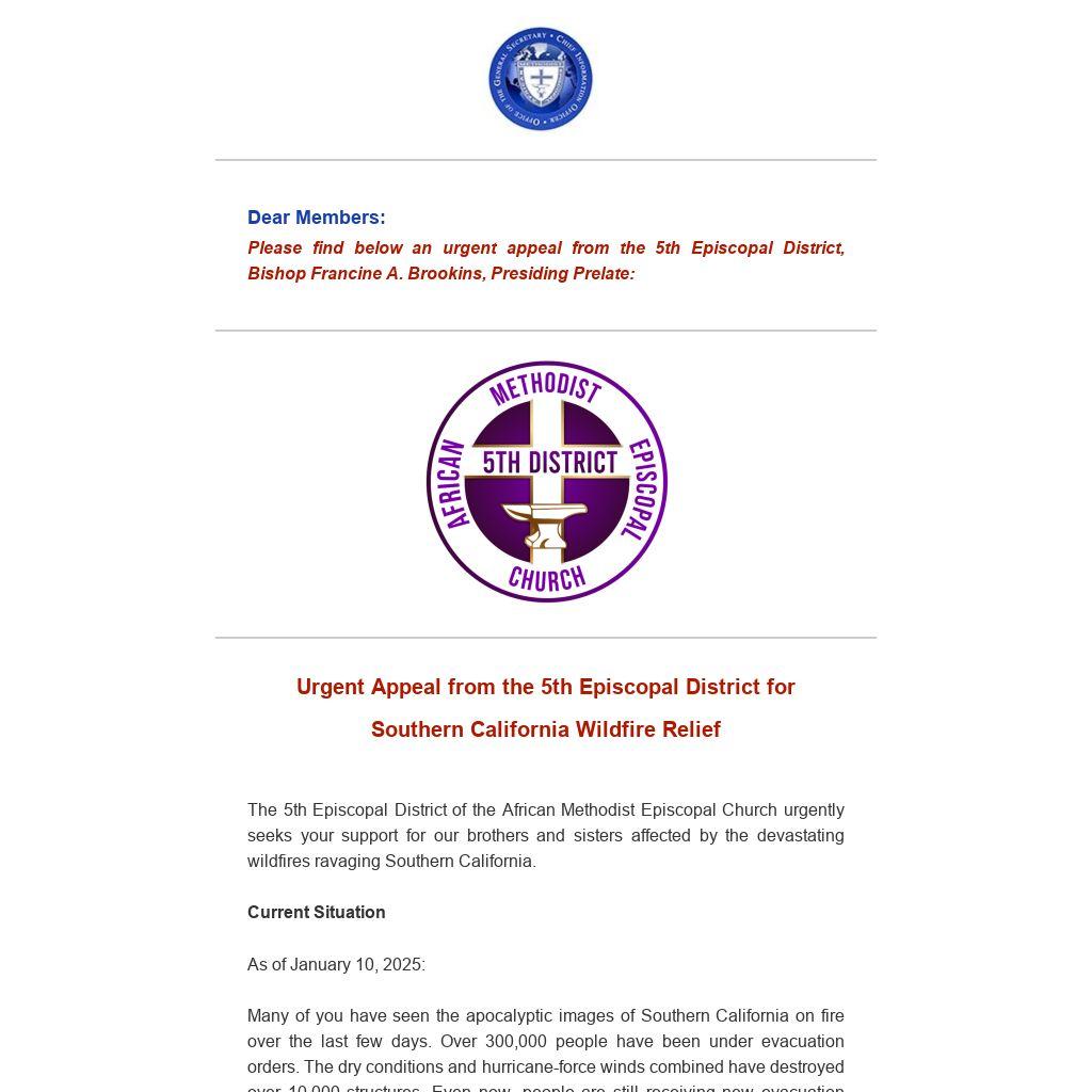 The 5th Episcopal District of the African Methodist Episcopal Church urgently seeks your support for our brothers and sisters affected by the devastating wildfires ravaging Southern California.