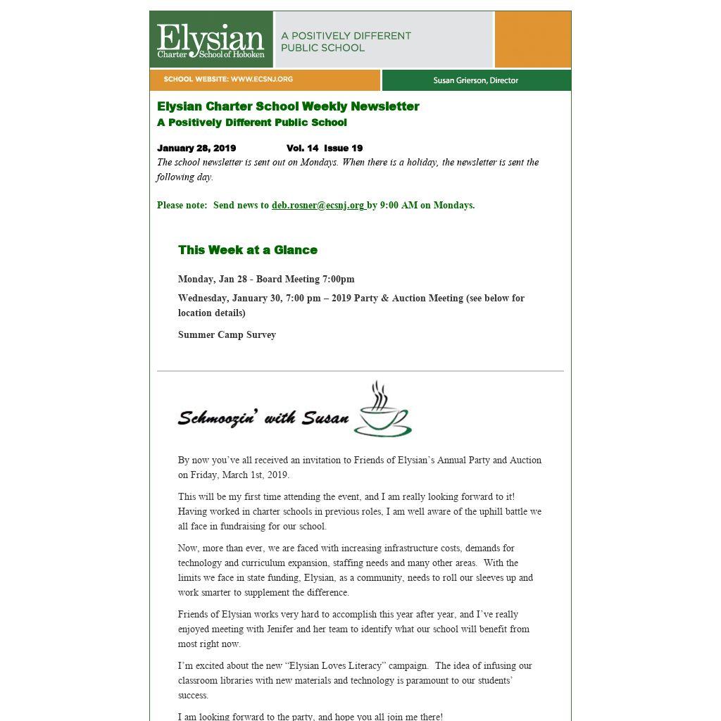This Week at a GlanceMonday, Jan 28 - Board Meeting 7:00pmWednesday, January 30, 7:00 pm – 2019 Party & Auction Meeting (see below for location details) Summer Camp Survey