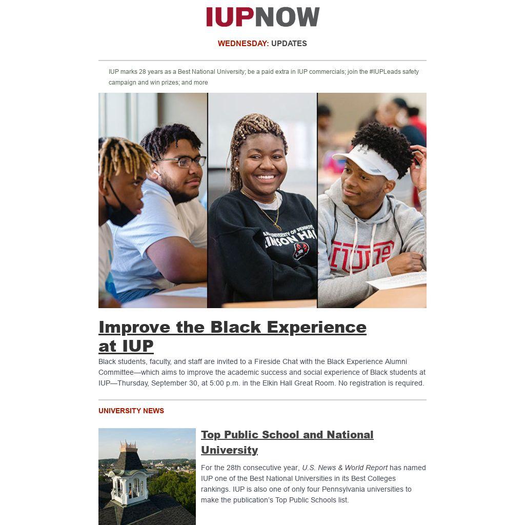 Black students, faculty, and staff are invited to a Fireside Chat with the Black Experience Alumni Committee—which aims to improve the academic success and social experience of Black students at IUP—Thursday, September 30, at 5:00 p.m. in the Elkin Hall Great Room. No registration is required.