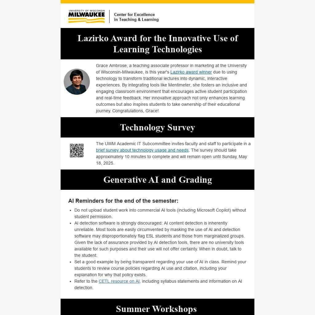 Grace Ambrose, a teaching associate professor in marketing at the University of Wisconsin-Milwaukee, is this year's Lazirko award winner due to using technology to transform traditional lectures into dynamic, interactive experiences. By integrating tools like Mentimeter, she fosters an inclusive and engaging classroom environment that encourages active student participation and real-time feedback. Her innovative approach not only enhances learning outcomes but also inspires students to take ownership of their educational journey. Congratulations, Grace!
