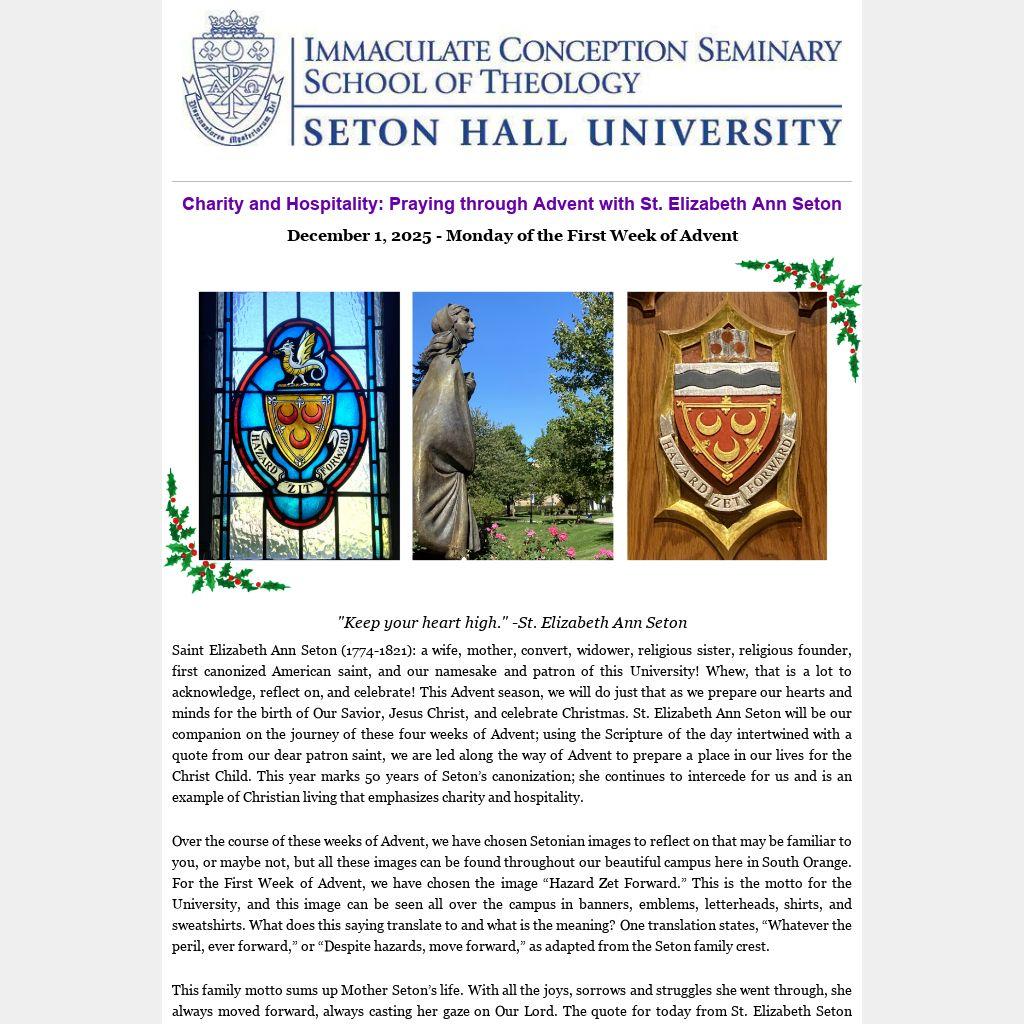 As we begin this Advent season, let us have the assurance of our faith in Christ like the Centurion and St. Elizabeth Ann Seton—that no matter what the peril we are experiencing in life, we move forward, confident that we are in God’s hands. During this First Week of Advent, let us contemplate our University motto inherited from Mother Seton, and let us help others realize in their own lives to always move forward, no matter what the obstacle may be.
