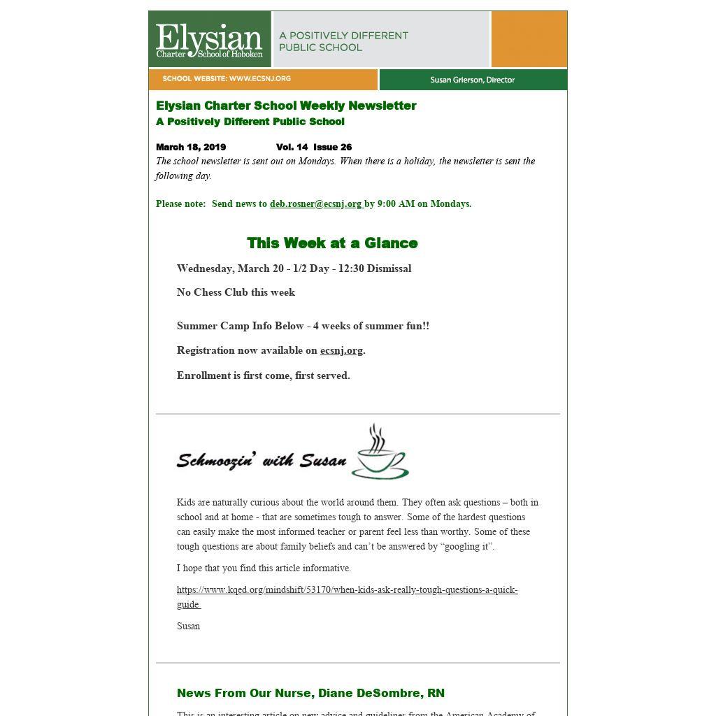 The school newsletter is sent out on Mondays. When there is a holiday, the newsletter is sent the following day.