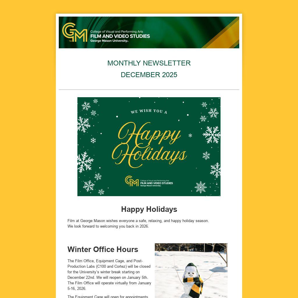 Film at George Mason wishes everyone a safe, relaxing, and happy holiday season. We look forward to welcoming you back in 2026.