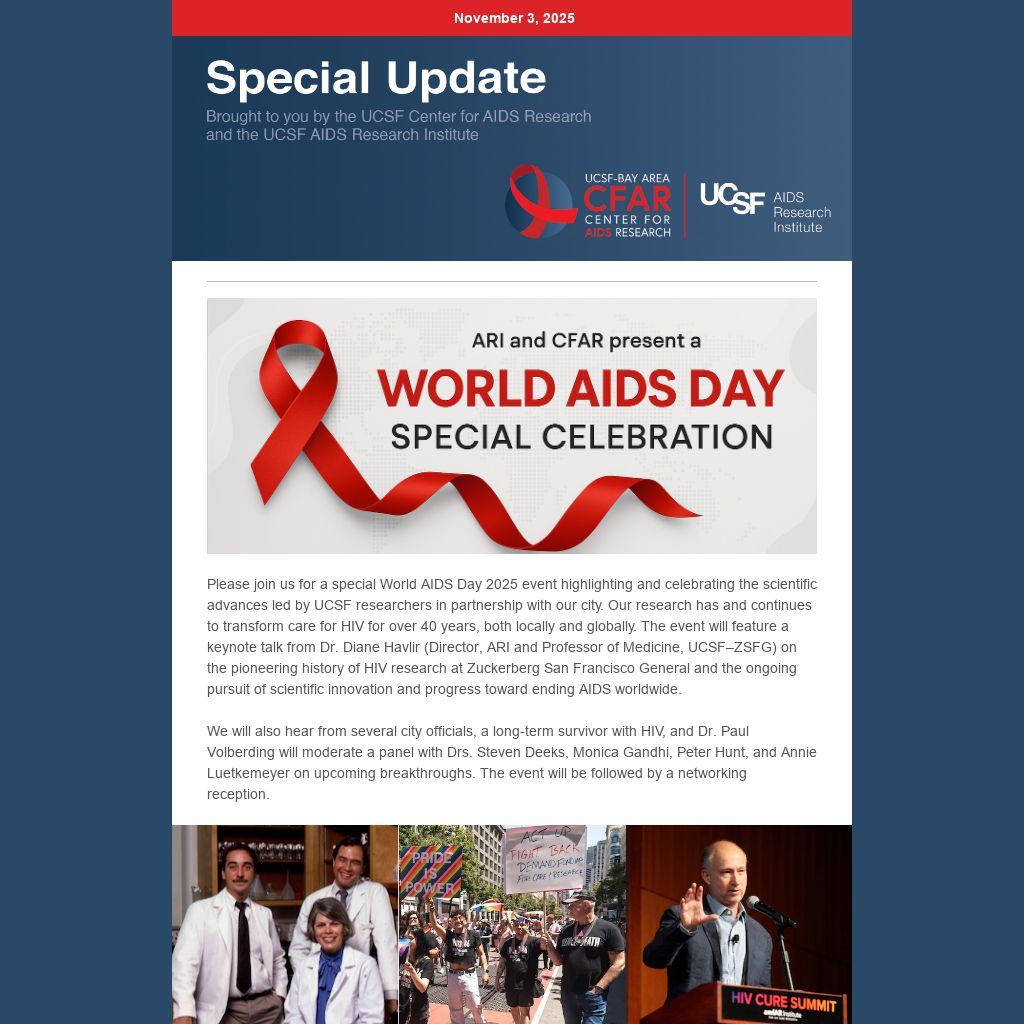 Please join us for a special World AIDS Day 2025 event highlighting and celebrating the scientific advances led by UCSF researchers in partnership with our city. Our research has and continues to transform care for HIV for over 40 years, both locally and globally. The event will feature a keynote talk from Dr. Diane Havlir (Director, ARI and Professor of Medicine, UCSF–ZSFG) on the pioneering history of HIV research at Zuckerberg San Francisco General and the ongoing pursuit of scientific innovation and progress toward ending AIDS worldwide.
