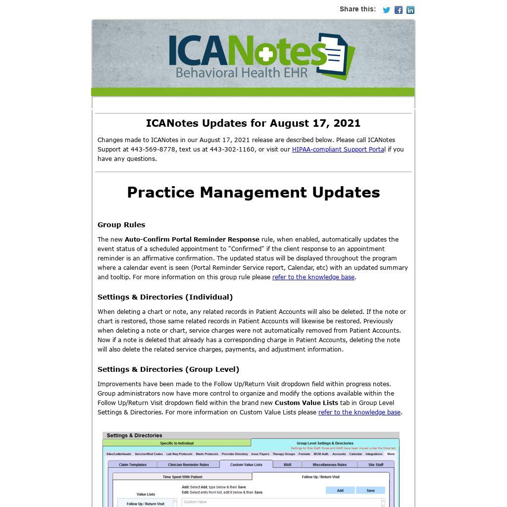 Changes made to ICANotes in our August 17, 2021 release are described below. Please call ICANotes Support at 443-569-8778, text us at 443-302-1160, or visit our HIPAA-compliant Support Portaif you have any questions.