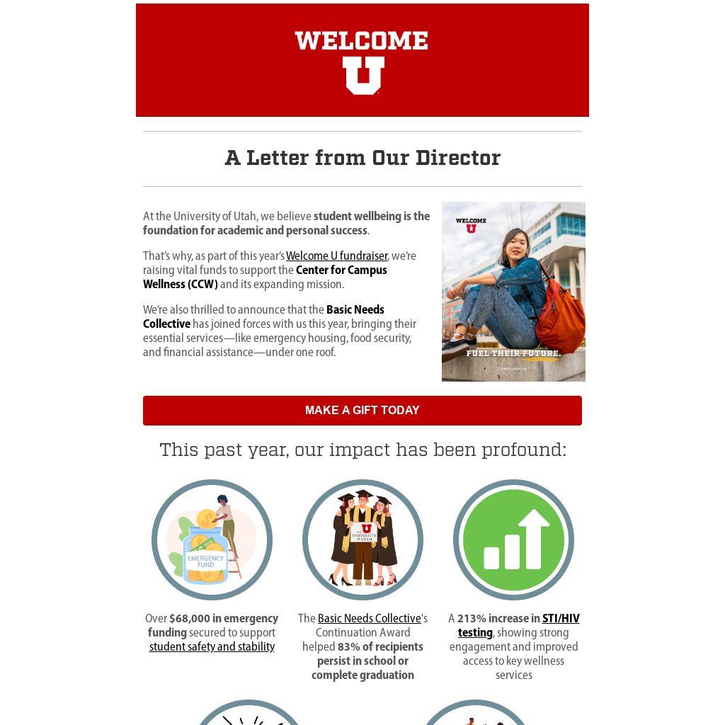 That’s why, as part of this year’s Welcome U fundraiser, we’re raising vital funds to support the Center for Campus Wellness (CCW) and its expanding mission.