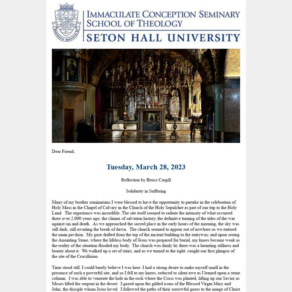 As I reflect on that experience on Calvary, I am reminded of the vital role that our Blessed Mother plays in each one of our lives. She stands with us through suffering, whether that be our own bodily suffering or interior struggle and anguish. She redirects our gaze away from our present trials and tribulations so that we might keep our eyes fixed on Jesus, “the pioneer and perfecter of our faith, who for the joy that was set before him endured the cross, despising shame, and is seated at the right hand of the throne of God” (Heb 12:2). At times, our Lenten journey can bring us face to face with suffering. It can seem too much to bear. In those times, we have a Mother to whom we can flee, who will cover us in her mantle and lead us to Jesus, to discover him in a new and beautiful way.