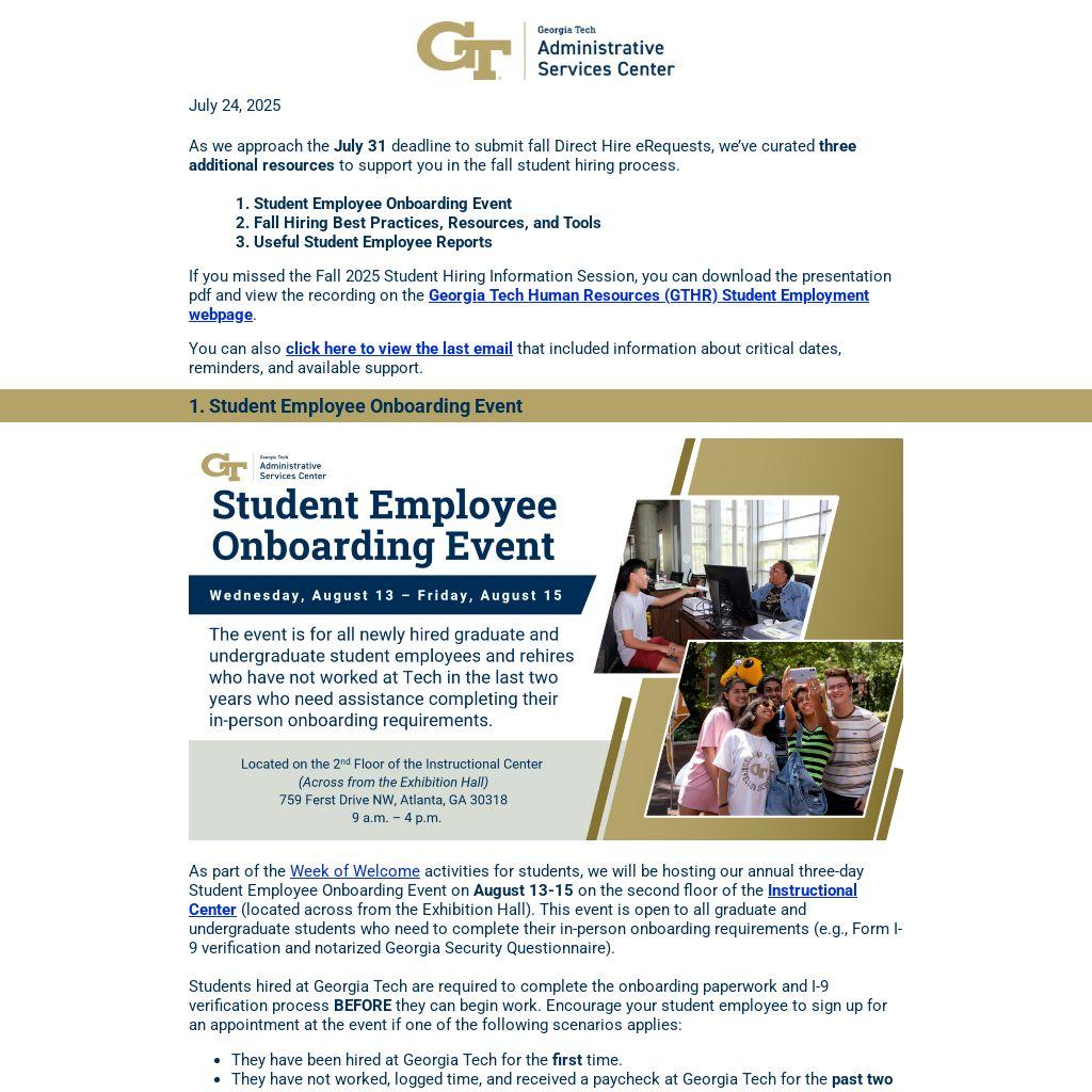 If you missed the Fall 2025 Student Hiring Information Session, you can download the presentation pdf and view the recording on the Georgia Tech Human Resources (GTHR) Student Employment webpage.