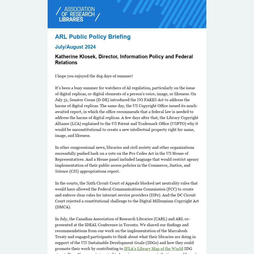 The monthly Public Policy Briefing highlights developments in ARL’s public policy priorities, issues that are relevant to the research library community in the United States and Canada, and details on advocacy conducted by ARL and the Canadian Association of Research Libraries (CARL). Please encourage your colleagues to sign up for the Public Policy Briefing.