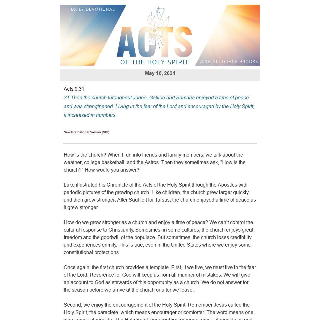 Second, we enjoy the encouragement of the Holy Spirit. Remember Jesus called the Holy Spirit, the paraclete, which means encourager or comforter. The word means one who comes alongside. The Holy Spirit, our great Encourager comes alongside us and encourages us. The Spirit puts courage in us. As a result, as we grow in deep reverence for the Lord and the full encouragement of the Spirit, we grow as the Lord brings people our way. How is the church? We are well, because we fear the Lord and we are encouraged by the Spirit. Spread the word. God will grow the church.