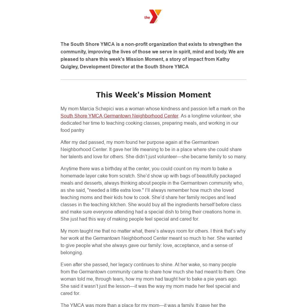 My mom Marcia Schepici was a woman whose kindness and passion left a mark on the South Shore YMCA Germantown Neighborhood Center. As a longtime volunteer, she dedicated her time to teaching cooking classes, preparing meals, and working in our food pantry