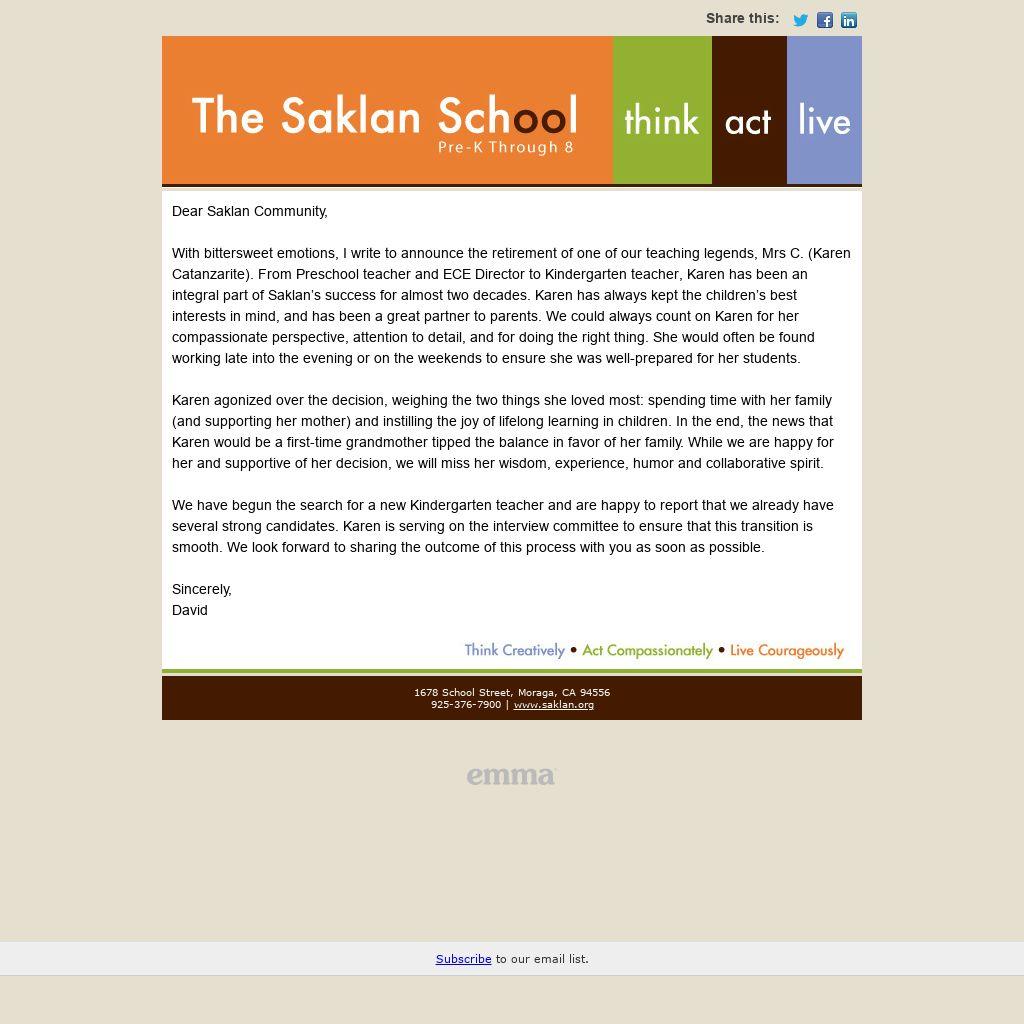 With bittersweet emotions, I write to announce the retirement of one of our teaching legends, Mrs C. (Karen Catanzarite). From Preschool teacher and ECE Director to Kindergarten teacher, Karen has been an integral part of Saklan’s success for almost two decades. Karen has always kept the children’s best interests in mind, and has been a great partner to parents. We could always count on Karen for her compassionate perspective, attention to detail, and for doing the right thing. She would often be found working late into the evening or on the weekends to ensure she was well-prepared for her students.
