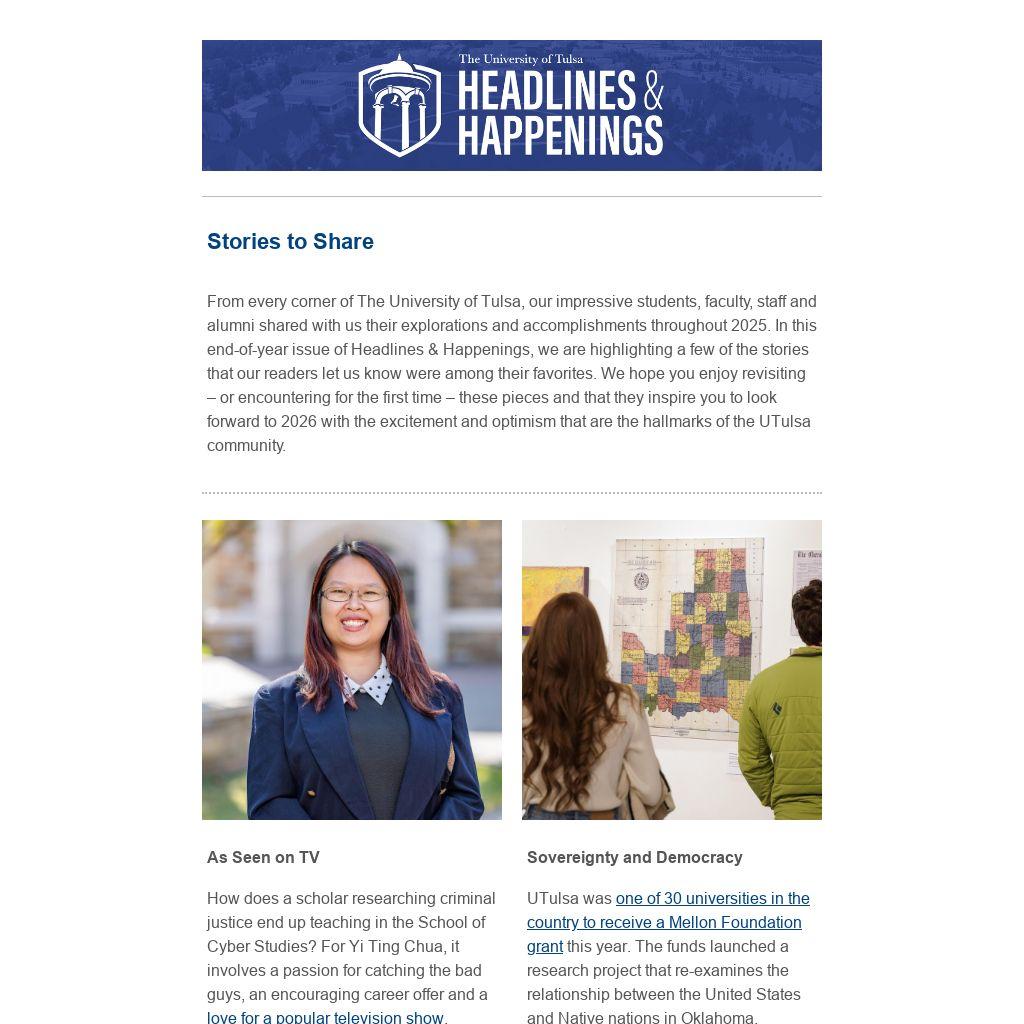 From every corner of The University of Tulsa, our impressive students, faculty, staff and alumni shared with us their explorations and accomplishments throughout 2025. In this end-of-year issue of Headlines & Happenings, we are highlighting a few of the stories that our readers let us know were among their favorites. We hope you enjoy revisiting – or encountering for the first time – these pieces and that they inspire you to look forward to 2026 with the excitement and optimism that are the hallmarks of the UTulsa community.