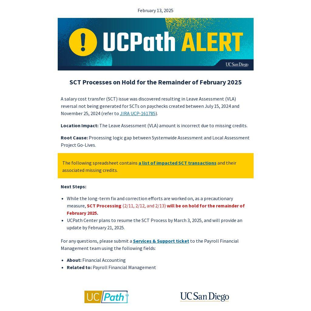 UCPath Center plans to resume the SCT Process by March 3, 2025, and will provide an update by February 21, 2025.